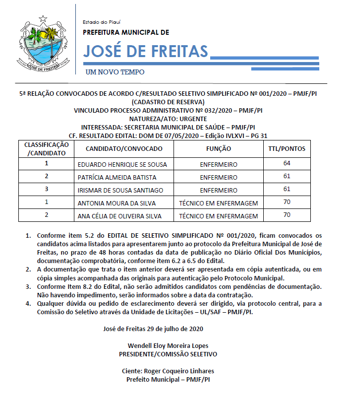 5ª RELAÇÃO CONVOCADOS DE ACORDO C/RESULTADO SELETIVO SIMPLIFICADO Nº 001/2020 – PMJF/PI (CADASTRO DE RESERVA)