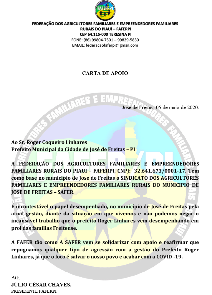 A FEDERAÇÃO DOS AGRICULTORES FAMILIARES E EMPREENDEDORES FAMILIARES RURAIS DO PIAUI – FAFERPI, emite carta de apôio aos recentes ataques sofridos ao prefeito Roger Linhares, Na carta a federção parabeniza o prefeito municipal pelo apôio e investimento na agricultura familiar do município.