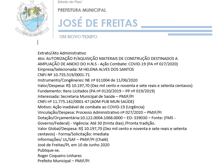 Ato: AUTORIZAÇÃO P/AQUISIÇÃO MATERAIS DE CONSTRUÇÃO DESTINADOS A AMPLIAÇÃO DE ANEXO DO H.N.S - Ação Combate: COVID-19 (PA nº 027/2020)