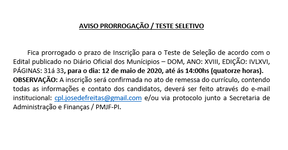 AVISO PRORROGAÇÃO / TESTE SELETIVO 001/2020