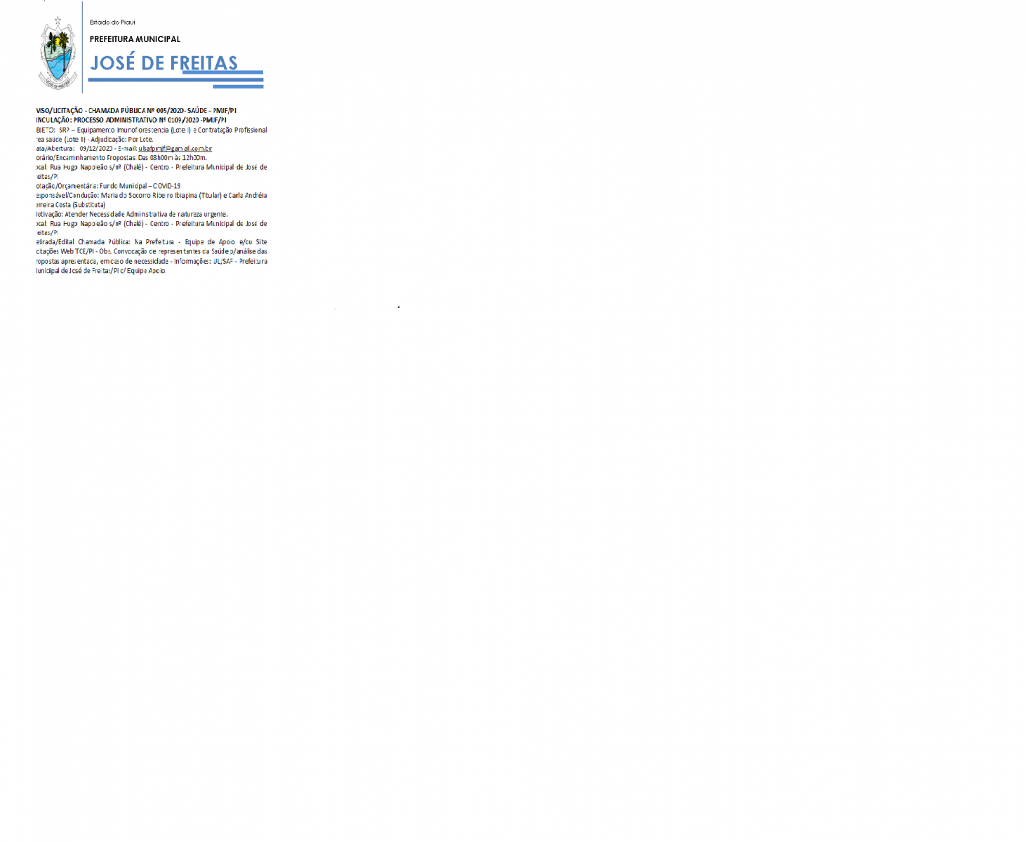 AVISO/LICITAÇÃO - CHAMADA PÚBLICA Nº 005/2020- SAÚDE - PMJF/PI VINCULAÇÃO: PROCESSO ADMINISTRATIVO Nº 0109/2020 -PMJF/PI