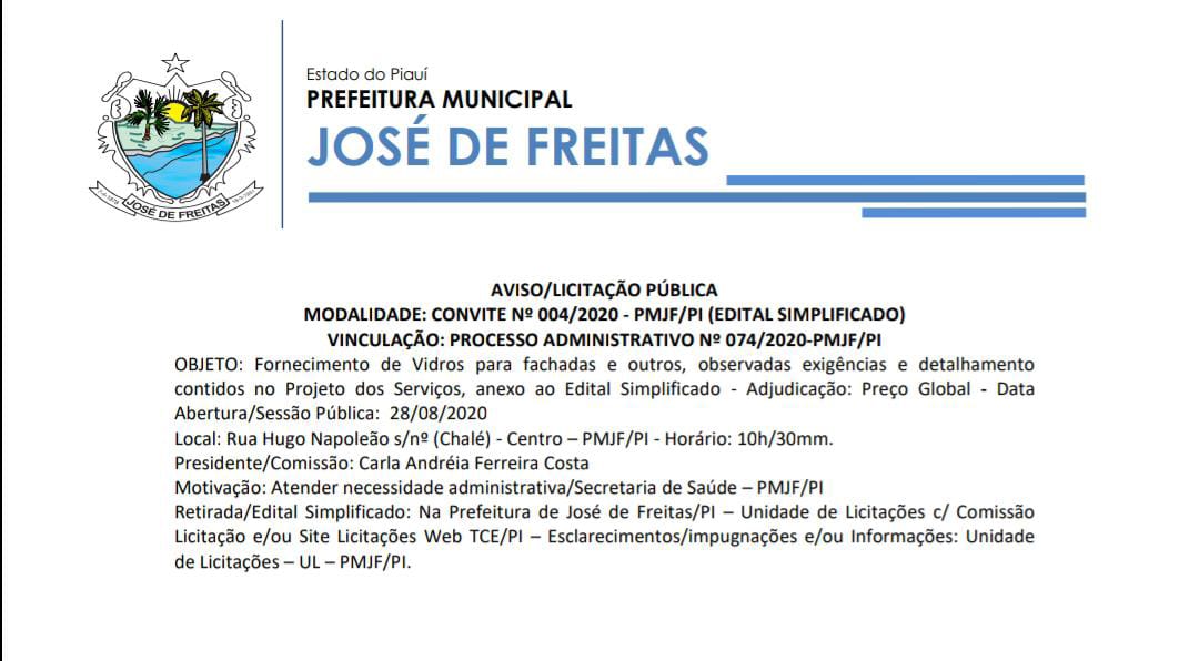 AVISO/LICITAÇÃO PÚBLICA MODALIDADE: CONVITE Nº 004/2020 - PMJF/PI (EDITAL SIMPLIFICADO) VINCULAÇÃO: PROCESSO ADMINISTRATIVO Nº 074/2020-PMJF/PI OBJETO: Fornecimento de Vidros para fachadas e outros, observadas exigências e detalhamento contidos no Projeto dos Serviços, anexo ao Edital Simplificado - Adjudicação: Preço Global - Data Abertura/Sessão Pública: 28/08/2020 Local: Rua Hugo Napoleão s/nº (Chalé) - Centro – PMJF/PI - Horário: 10h/30mm. Presidente/Comissão: Carla Andréia Ferreira Costa Motivação: Atender necessidade administrativa/Secretaria de Saúde – PMJF/PI Retirada/Edital Simplificado: Na Prefeitura de José de Freitas/PI – Unidade de Licitações c/ Comissão Licitação e/ou Site Licitações Web TCE/PI – Esclarecimentos/impugnações e/ou Informações: Unidade de Licitações – UL – PMJF/PI.