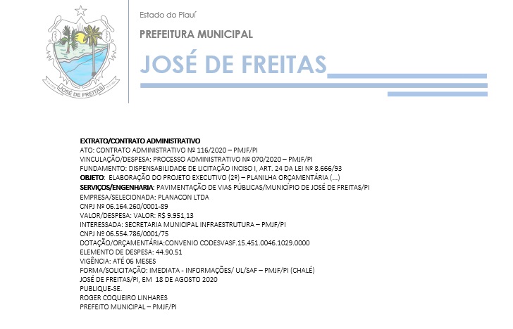 ATO: CONTRATO ADMINISTRATIVO Nº 116/2020 – PMJF/PI