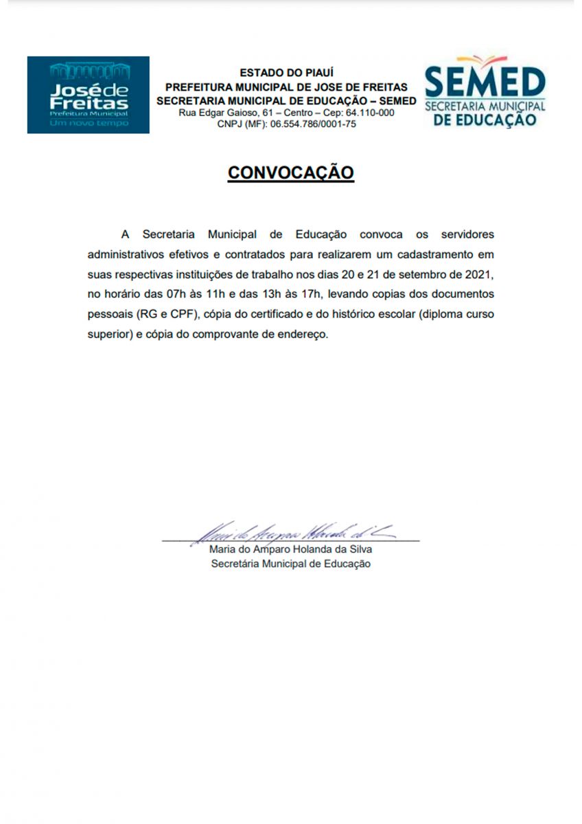 A Secretaria Municipal de Educação convoca os servidores administrativos efetivos e contratados para realizarem um cadastramento em suas respectivas instituições de trabalho nos dias 20 e 21 de setembro de 2021, no horário das 07h às 11h e das 13h às 17h, levando copias dos documentos pessoais (RG e CPF), cópia do certificado e do histórico escolar (diploma curso superior) e cópia do comprovante de endereço.