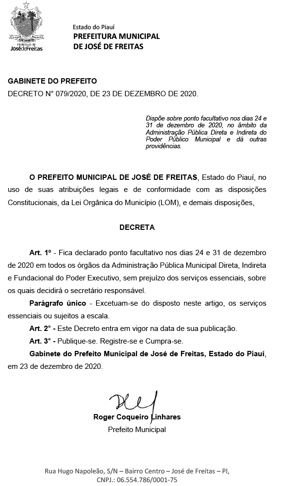 O PREFEITO MUNICIPAL DE JOSÉ DE FREITAS, Estado do Piauí, no uso de suas atribuições legais e de conformidade com as disposições Constitucionais, da Lei Orgânica do Município (LOM), e demais disposições, DECRETA Art. 1º - Fica declarado ponto facultativo nos dias 24 e 31 de dezembro de 2020 em todos os órgãos da Administração Pública Municipal Direta, Indireta e Fundacional do Poder Executivo, sem prejuízo dos serviços essenciais, sobre os quais decidirá o secretário responsável. Parágrafo único - Excetuam-se do disposto neste artigo, os serviços essenciais ou sujeitos a escala. Art. 2° - Este Decreto entra em vigor na data de sua publicação. Art. 3° - Publique-se. Registre-se e Cumpra-se. Gabinete do Prefeito Municipal de José de Freitas, Estado do Piauí, em 23 de dezembro de 2020.