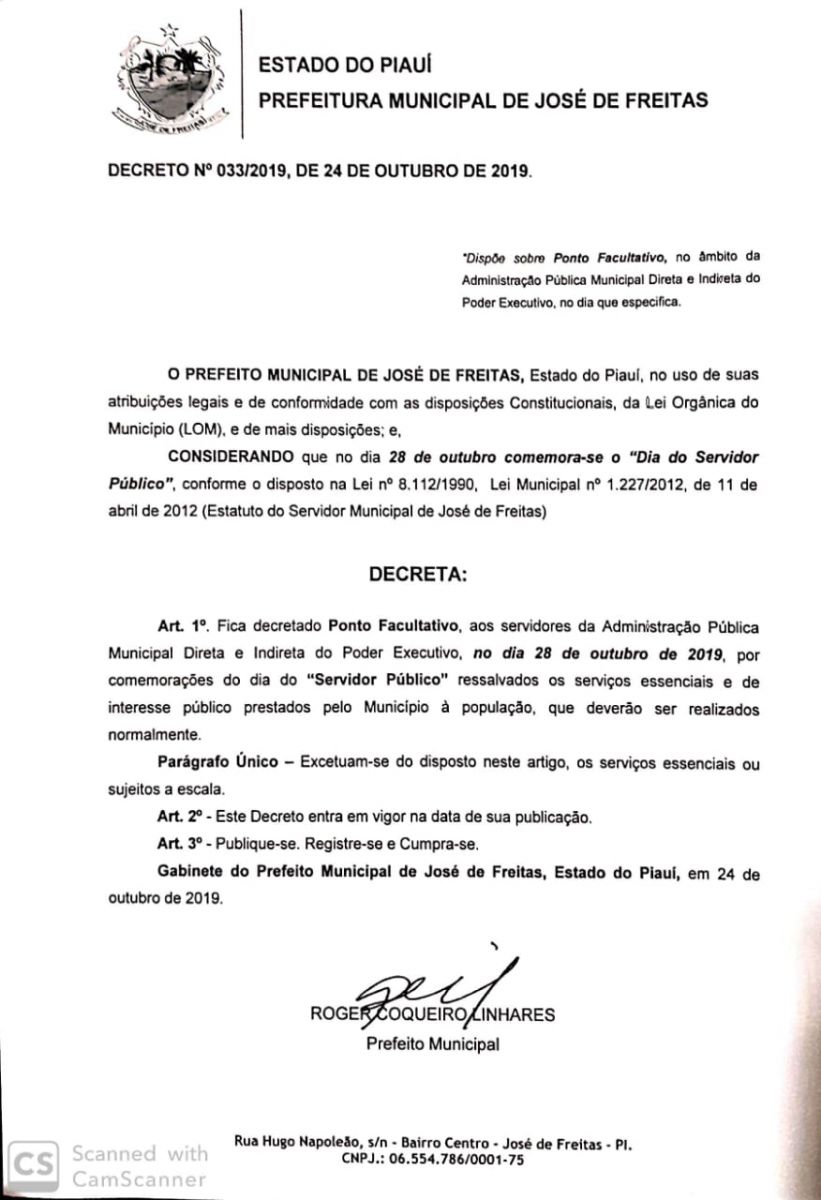 O prefeito Roger Coqueiro Linhares decreta ponto facultativo no dia 28 de outubro de 2019, por comemoração do "dia do servidor"