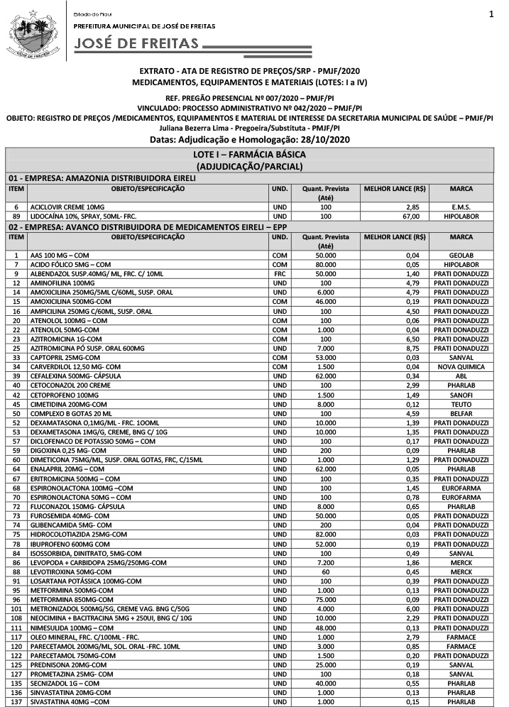 EXTRATO - ATA DE REGISTRO DE PREÇOS/SRP - PMJF/2020 MEDICAMENTOS, EQUIPAMENTOS E MATERIAIS (LOTES: I a IV)