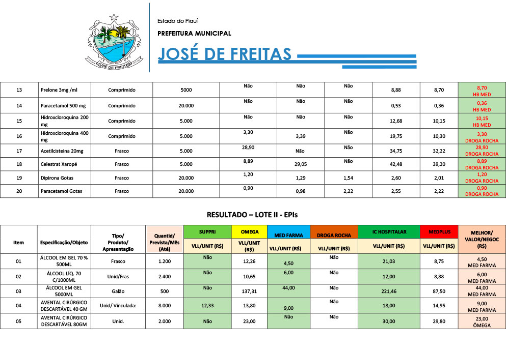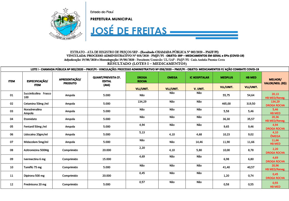 LOTE I - CHAMADA PÚBLICA Nº 002/2020 – PMJF/PI - VINCULAÇÃO: PROCESSO ADMINISTRATIVO Nº 058/2020 – PMJF/PI - OBJETO: MEDICAMENTOS P/ AÇÃO COMBATE COVID-19 |