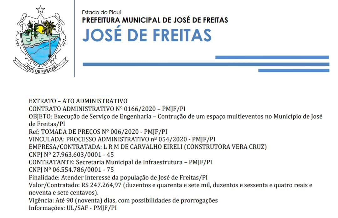 EXTRATO – ATO ADMINISTRATIVO CONTRATO ADMINISTRATIVO N° 0166/2020 – PMJF/PI OBJETO: Execução de Serviço de Engenharia – Contrução de um espaço multieventos no Município de José de Freitas/PI Ref: TOMADA DE PREÇOS Nº 006/2020 - PMJF/PI VINCULADA: PROCESSO ADMINISTRATIVO nº 054/2020 - PMJF/PI EMPRESA/CONTRATADA: L R M DE CARVALHO EIRELI (CONSTRUTORA VERA CRUZ) CNPJ Nº 27.963.603/0001 - 45 CONTRATANTE: Secretaria Municipal de Infraestrutura – PMJF/PI CNPJ Nº 06.554.786/0001 - 75 Finalidade: Atender interesse da população de José de Freitas/PI Valor/Contratado: R$ 247.264,97 (duzentos e quarenta e sete mil, duzentos e sessenta e quatro reais e noventa e sete centavos). Vigência: Até 90 (noventa) dias, com possibilidades de prorrogações Informações: UL/SAF - PMJF/PI