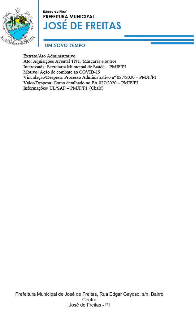 Extrato/Ato Administrativo Ato: Aquisições Avental TNT, Máscaras e outros Interessada: Secretaria Municipal de Saúde – PMJF/PI Motivo: Ação de combate ao COVID-19 Vinculação/Despesa: Processo Administrativo nº 027/2020 – PMJF/PI Valor/Despesa: Como detalhado no PA 027/2020 – PMJF/PI Informações/ UL/SAF – PMJF/PI (Chalé)
