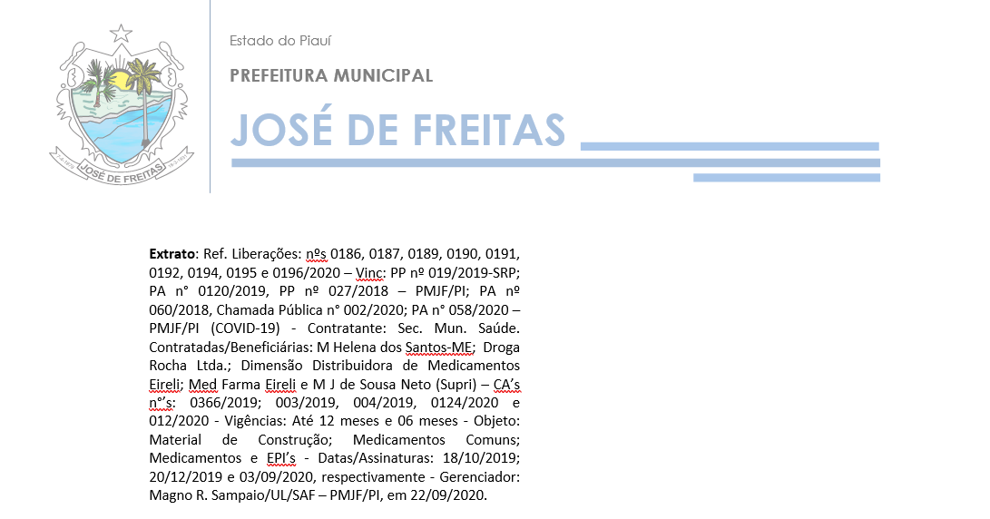 Extrato: Ref. Liberações: nºs 0186, 0187, 0189, 0190, 0191, 0192, 0194, 0195 e 0196/2020 – Vinc: PP nº 019/2019-SRP; PA n° 0120/2019, PP nº 027/2018 – PMJF/PI; PA nº 060/2018, Chamada Pública n° 002/2020; PA n° 058/2020 –PMJF/PI (COVID-19) - Contratante: Sec. Mun. Saúde. Contratadas/Beneficiárias: M Helena dos Santos-ME; Droga Rocha Ltda.; Dimensão Distribuidora de Medicamentos Eireli; Med Farma Eireli e M J de Sousa Neto (Supri) – CA’s n°’s: 0366/2019; 003/2019, 004/2019, 0124/2020 e 012/2020 - Vigências: Até 12 meses e 06 meses - Objeto: Material de Construção; Medicamentos Comuns; Medicamentos e EPI’s - Datas/Assinaturas: 18/10/2019; 20/12/2019 e 03/09/2020, respectivamente - Gerenciador: Magno R. Sampaio/UL/SAF – PMJF/PI, em 22/09/2020.