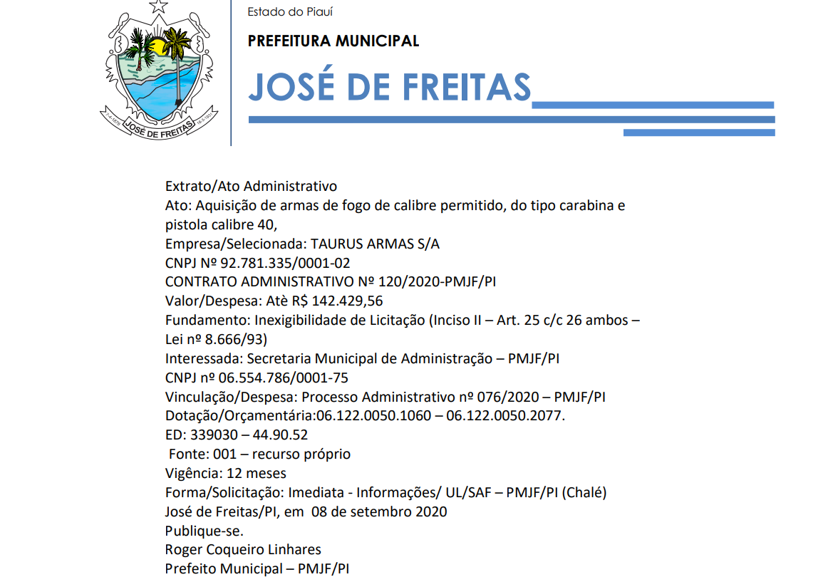 Extrato/Ato Administrativo Ato: Aquisição de armas de fogo de calibre permitido, do tipo carabina e pistola calibre 40, Empresa/Selecionada: TAURUS ARMAS S/A CNPJ Nº 92.781.335/0001-02 CONTRATO ADMINISTRATIVO Nº 120/2020-PMJF/PI Valor/Despesa: Atè R$ 142.429,56 Fundamento: Inexigibilidade de Licitação (Inciso II – Art. 25 c/c 26 ambos – Lei nº 8.666/93) Interessada: Secretaria Municipal de Administração – PMJF/PI CNPJ nº 06.554.786/0001-75 Vinculação/Despesa: Processo Administrativo nº 076/2020 – PMJF/PI Dotação/Orçamentária:06.122.0050.1060 – 06.122.0050.2077. ED: 339030 – 44.90.52 Fonte: 001 – recurso próprio Vigência: 12 meses Forma/Solicitação: Imediata - Informações/ UL/SAF – PMJF/PI (Chalé) José de Freitas/PI, em 08 de setembro 2020 Publique-se. Roger Coqueiro Linhares Prefeito Municipal – PMJF/PI