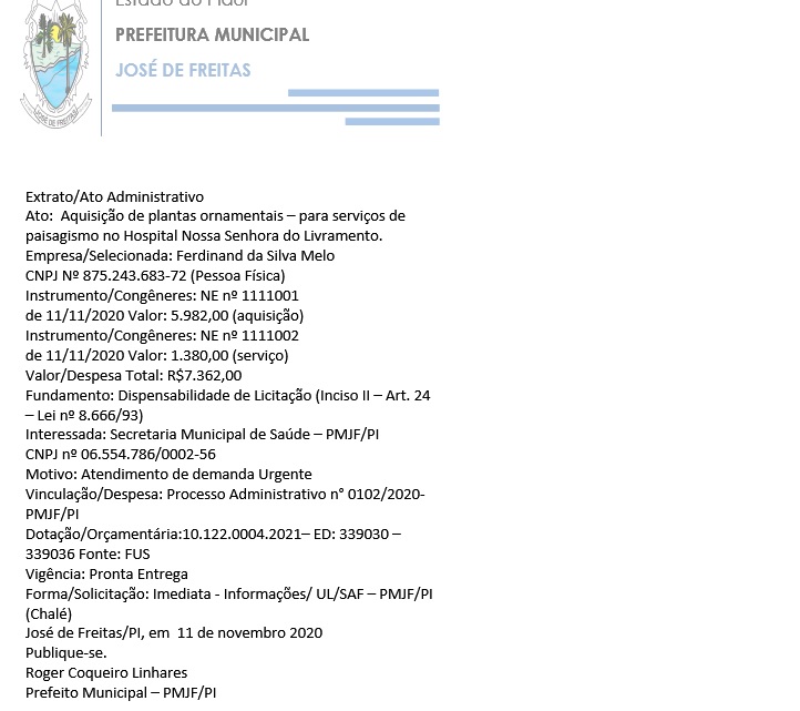 Vinculação/Despesa: Processo Administrativo n° 0102/2020-PMJF/PI