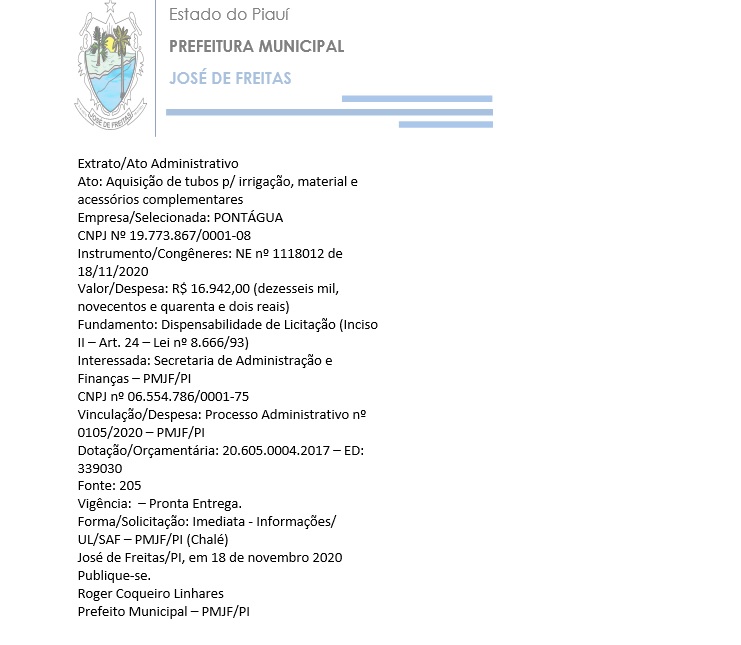 Vinculação/Despesa: Processo Administrativo nº 0105/2020 – PMJF/PI