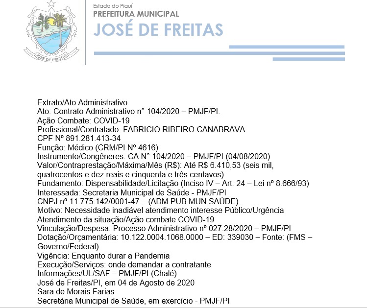 Extrato/Ato Administrativo Ato: Contrato Administrativo n° 104/2020 – PMJF/PI. Ação Combate: COVID-19 Profissional/Contratado: FABRICIO RIBEIRO CANABRAVA CPF Nº 891.281.413-34 Função: Médico (CRM/PI Nº 4616) Instrumento/Congêneres: CA N° 104/2020 – PMJF/PI (04/08/2020) Valor/Contraprestação/Máxima/Mês (R$): Até R$ 6.410,53 (seis mil, quatrocentos e dez reais e cinquenta e três centavos) Fundamento: Dispensabilidade/Licitação (Inciso IV – Art. 24 – Lei nº 8.666/93) Interessada: Secretaria Municipal de Saúde - PMJF/PI CNPJ nº 11.775.142/0001-47 – (ADM PUB MUN SAÚDE) Motivo: Necessidade inadiável atendimento interesse Público/Urgência Atendimento da situação/Ação combate COVID-19 Vinculação/Despesa: Processo Administrativo nº 027.28/2020 – PMJF/PI Dotação/Orçamentária: 10.122.0004.1068.0000 – ED: 339030 – Fonte: (FMS – Governo/Federal) Vigência: Enquanto durar a Pandemia Execução/Serviços: onde demandar a contratante Informações/UL/SAF – PMJF/PI (Chalé) José de Freitas/PI, em 04 de Agosto de 2020 Sara de Morais Farias Secretária Municipal de Saúde, em exercício - PMJF/PI
