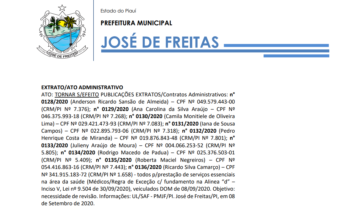 EXTRATO/ATO ADMINISTRATIVO ATO: TORNAR S/EFEITO PUBLICAÇÕES EXTRATOS/Contratos Administrativos: n° 0128/2020 (Anderson Ricardo Sansão de Almeida) – CPF Nº 049.579.443-00 (CRM/PI Nº 7.376); n° 0129/2020 (Ana Carolina da Silva Araújo – CPF Nº 046.375.993-18 (CRM/PI Nº 7.268); n° 0130/2020 (Camila Monitiele de Oliveira Lima) – CPF Nº 029.421.473-93 (CRM/PI Nº 7.083); n° 0131/2020 (Iana de Sousa Campos) – CPF Nº 022.895.793-06 (CRM/PI Nº 7.318); n° 0132/2020 (Pedro Henrique Costa de Miranda) – CPF Nº 019.876.843-48 (CRM/PI Nº 7.801); n° 0133/2020 (Julieny Araújo de Moura) – CPF Nº 004.066.253-52 (CRM/PI Nº 5.805); n° 0134/2020 (Rodrigo Macedo de Padua) – CPF Nº 025.376.503-01 (CRM/PI Nº 5.409); n° 0135/2020 (Roberta Maciel Negreiros) – CPF Nº 054.416.863-16 (CRM/PI Nº 7.443); n° 0136/2020 (Ricardo Silva Camarço) – CPF Nº 341.915.183-72 (CRM/PI Nº 1.658) - todos p/prestação de serviços essenciais na área da saúde (Médicos/Regra de Exceção c/ fundamento na Alinea “d” – Inciso V, Lei nº 9.504 de 30/09/2020), veiculados DOM de 08/09/2020. Objetivo: necessidade de revisão. Informações: UL/SAF - PMJF/PI. José de Freitas/PI, em 08 de Setembro de 2020.