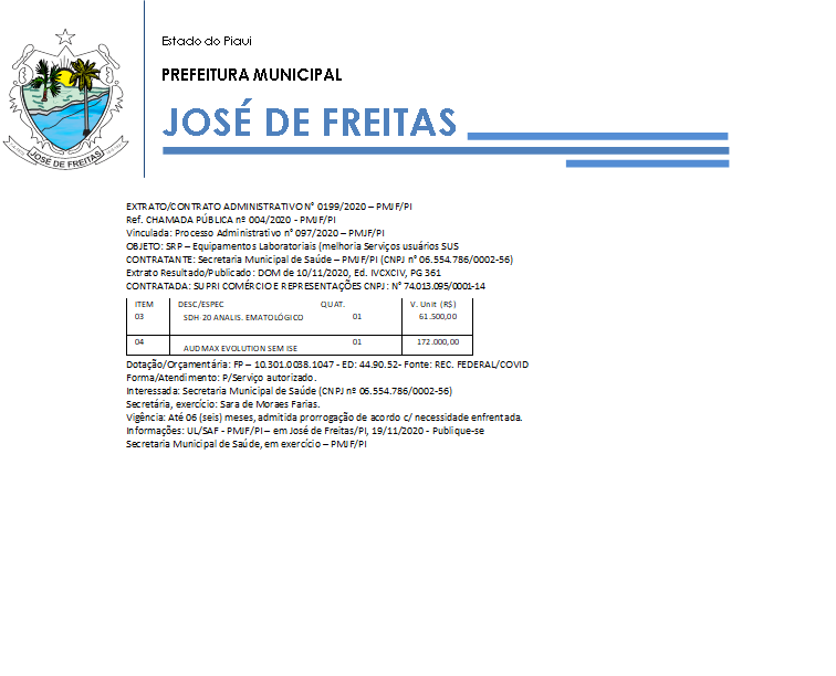 EXTRATO/CONTRATO ADMINISTRATIVO N° 0199/2020 – PMJF/PI Ref. CHAMADA PÚBLICA nº 004/2020 - PMJF/PI Vinculada: Processo Administrativo n° 097/2020 – PMJF/PI.