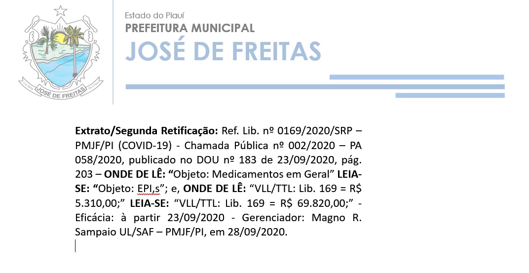 Extrato/Segunda Retificação: Ref. Lib. nº 0169/2020/SRP – PMJF/PI (COVID-19) - Chamada Pública nº 002/2020 – PA 058/2020, publicado no DOU nº 183 de 23/09/2020, pág. 203 – ONDE DE LÊ: “Objeto: Medicamentos em Geral” LEIA-SE: “Objeto: EPI,s”; e, ONDE DE LÊ: “VLL/TTL: Lib. 169 = R$ 5.310,00;” LEIA-SE: “VLL/TTL: Lib. 169 = R$ 69.820,00;” - Eficácia: à partir 23/09/2020 - Gerenciador: Magno R. Sampaio UL/SAF – PMJF/PI, em 28/09/2020.