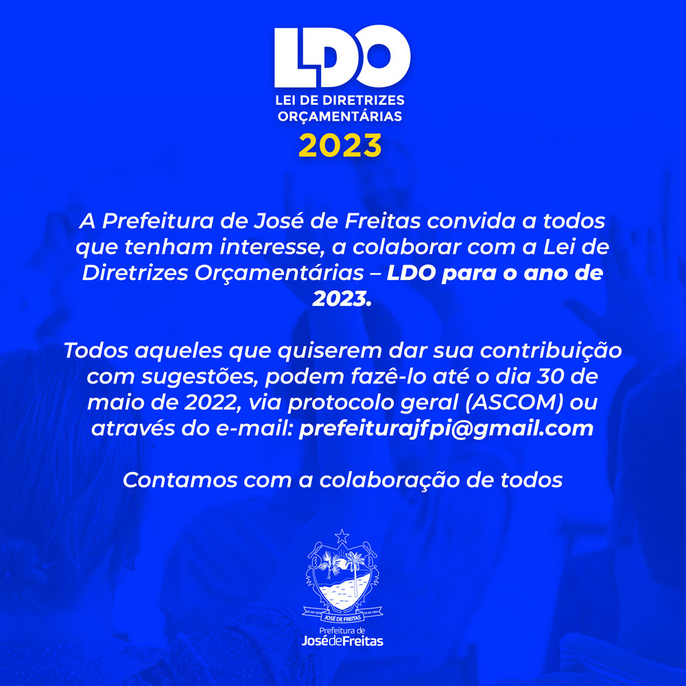 A Prefeitura de José de Freitas convida a todos que tenham interesse em colaborar com a Lei de Diretrizes Orçamentárias – LDO para o ano de 2023, a fazê-lo até o dia 30 de maio de 2022, via protocolo geral (ASCOM) ou através do e-mail [email protected]
