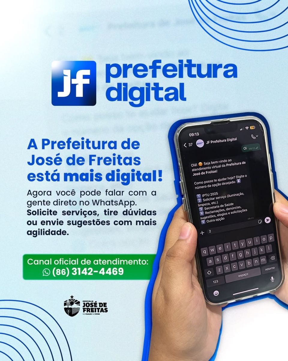 A Prefeitura Municipal de José de Freitas acaba de lançar o JF Prefeitura Digital, um canal oficial no WhatsApp para facilitar a comunicação entre a população e a gestão municipal. Com o novo serviço, a população pode tirar dúvidas, solicitar serviços, fazer denúncias, sugestões, elogios e muito mais, tudo de forma simples e rápida, diretamente pelo aplicativo de mensagens.