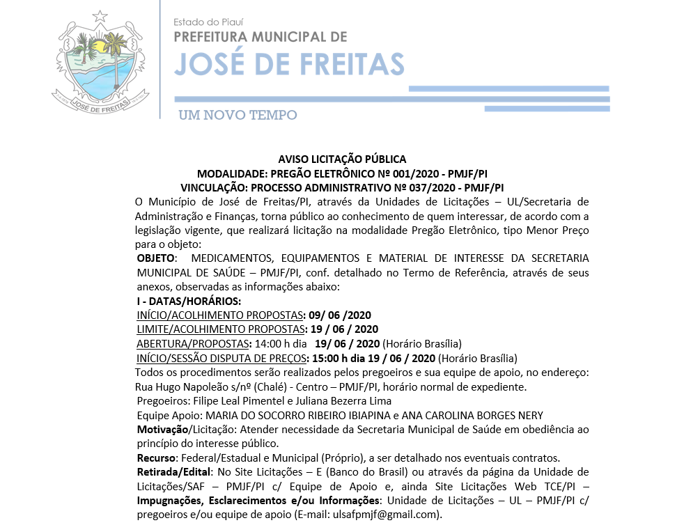 PREGÃO ELETRÔNICO Nº 001/2020 - PMJF/PI - MEDICAMENTOS, EQUIPAMENTOS E MATERIAL DE INTERESSE DA SECRETARIA MUNICIPAL DE SAÚDE – PMJF/PI