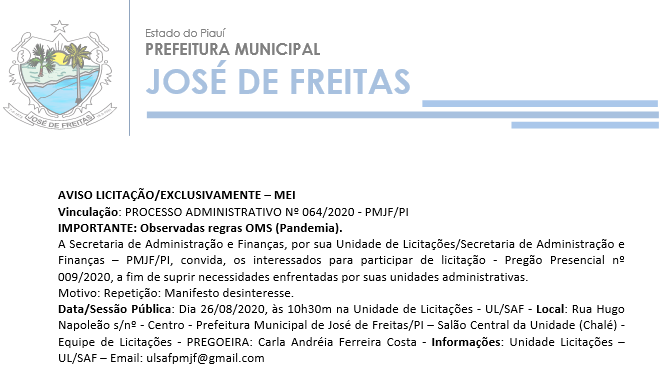 Data/Sessão Pública: Dia 26/08/2020, às 10h30m na Unidade de Licitações - UL/SAF - Local: Rua Hugo Napoleão s/nº - Centro - Prefeitura Municipal de José de Freitas/PI – Salão Central da Unidade (Chalé) - Equipe de Licitações - PREGOEIRA: Carla Andréia Ferreira Costa - Informações: Unidade Licitações – UL/SAF – Email: [email protected]