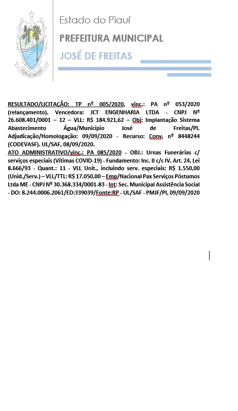 RESULTADO/LICITAÇÃO: TP nº 005/2020, vinc.: PA nº 053/2020 (relançamento). Vencedora: JCT ENGENHARIA LTDA - CNPJ Nº 26.608.401/0001 – 12 – VLL: R$ 184.921,62 – Obj: Implantação Sistema Abastecimento Água/Município José de Freitas/PI. Adjudicação/Homologação: 09/09/2020 - Recurso: Conv. nº 8448244 (CODEVASF). UL/SAF, 08/09/2020.