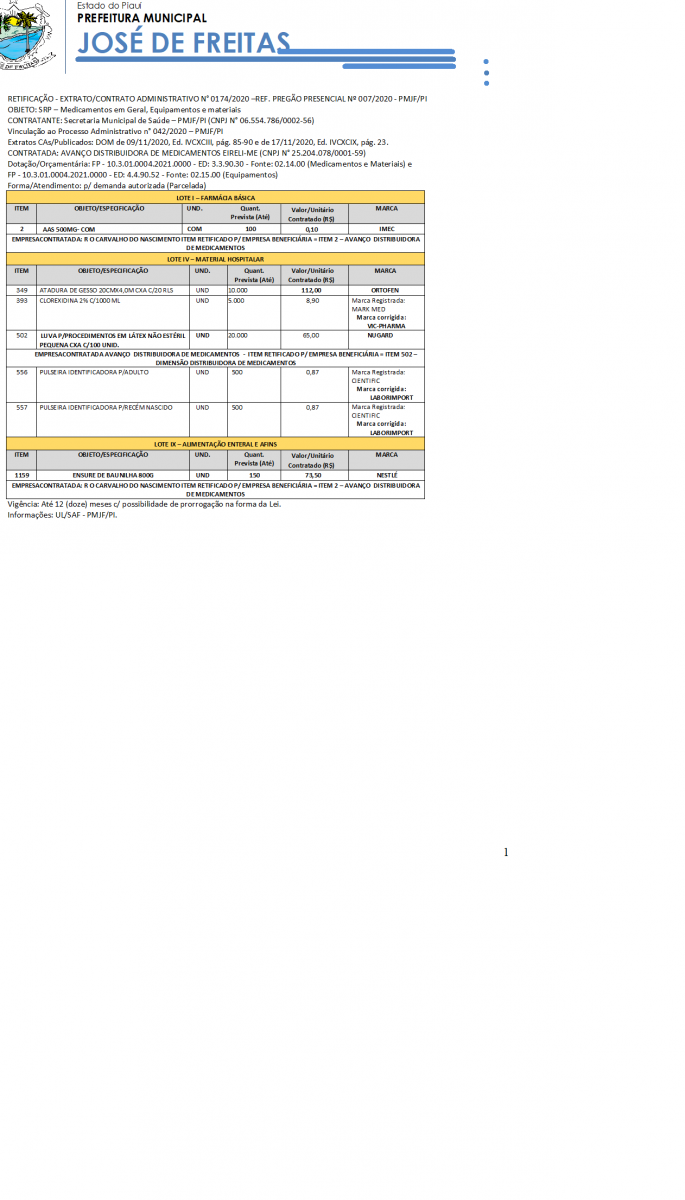 RETIFICAÇÃO - EXTRATO/CONTRATO ADMINISTRATIVO N° 0174/2020 –REF. PREGÃO PRESENCIAL Nº 007/2020 - PMJF/PI OBJETO: SRP – Medicamentos em Geral, Equipamentos e materiais CONTRATANTE: Secretaria Municipal de Saúde – PMJF/PI (CNPJ N° 06.554.786/0002-56) Vinculação ao Processo Administrativo n° 042/2020 – PMJF/PI