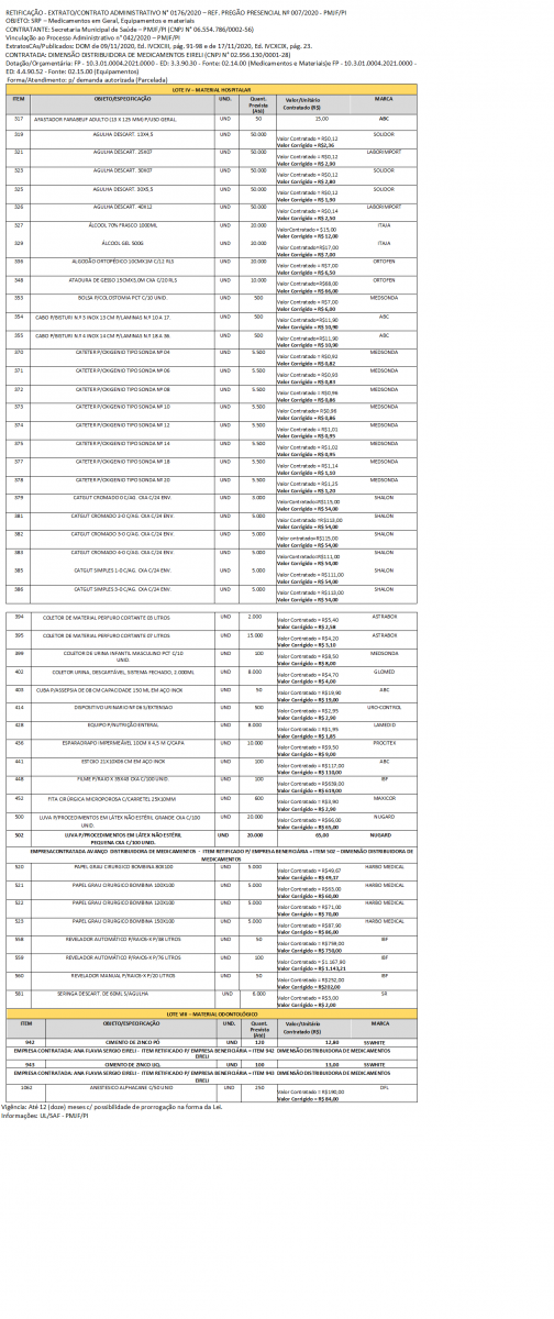 RETIFICAÇÃO - EXTRATO/CONTRATO ADMINISTRATIVO N° 0176/2020 – REF. PREGÃO PRESENCIAL Nº 007/2020 - PMJF/PI OBJETO: SRP – Medicamentos em Geral, Equipamentos e materiais CONTRATANTE: Secretaria Municipal de Saúde – PMJF/PI (CNPJ N° 06.554.786/0002-56) Vinculação ao Processo Administrativo n° 042/2020 – PMJF/PI