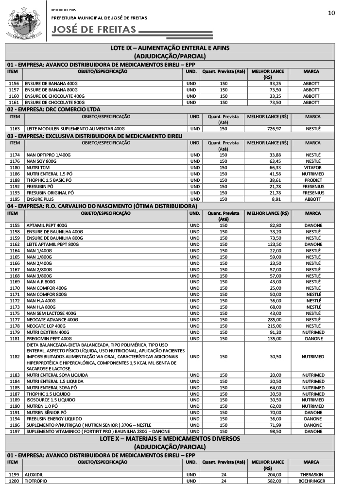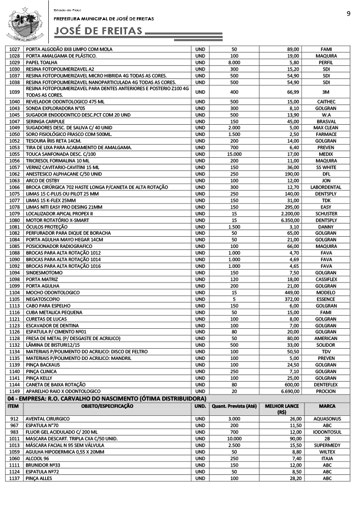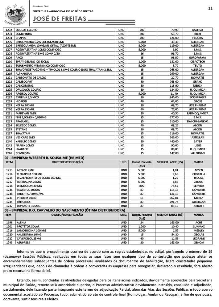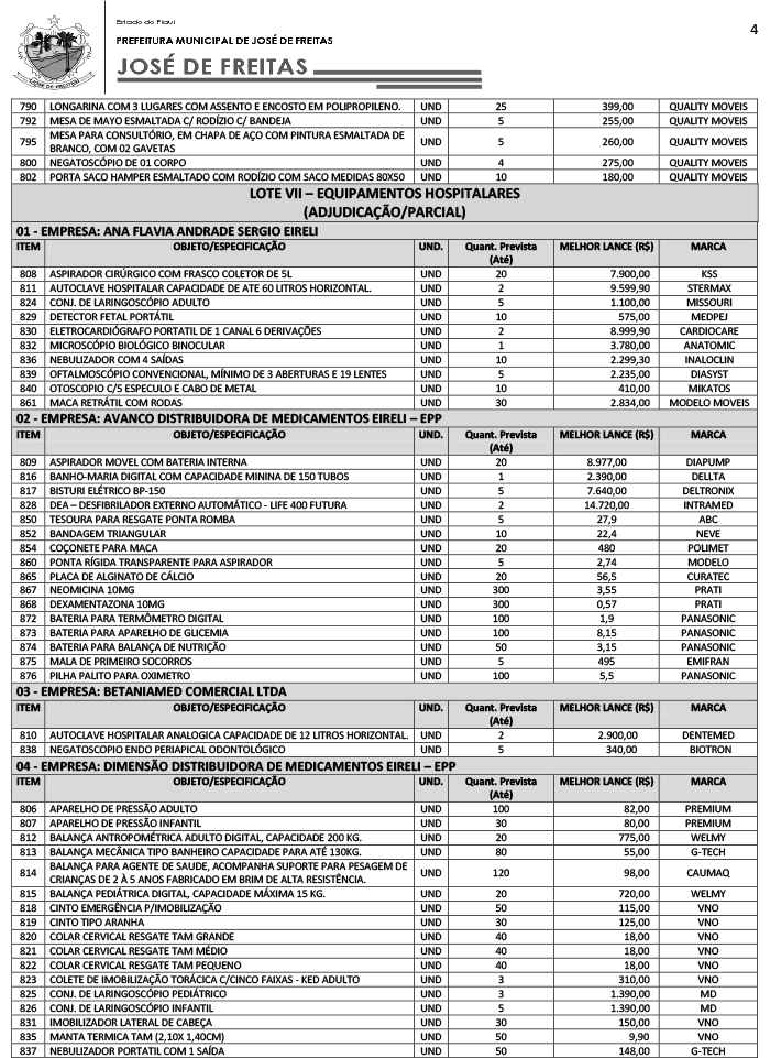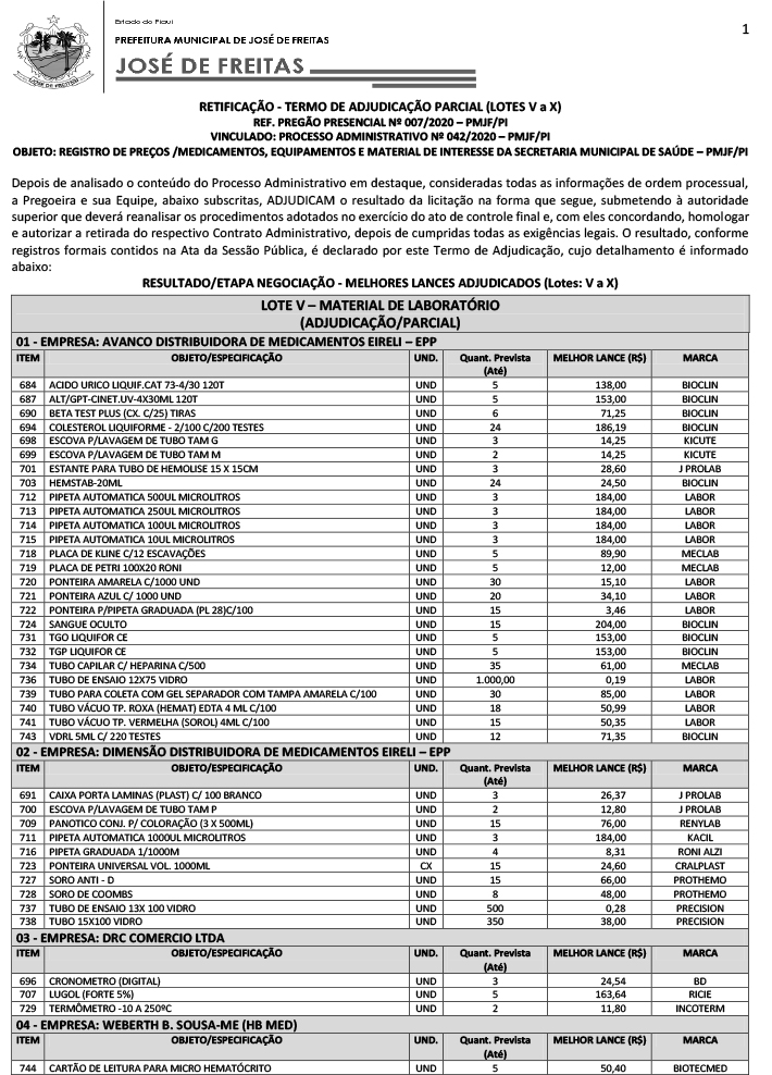 RETIFICAÇÃO - TERMO DE ADJUDICAÇÃO PARCIAL (LOTES V a X) REF. PREGÃO PRESENCIAL Nº 007/2020 – PMJF/PI VINCULADO: PROCESSO ADMINISTRATIVO Nº 042/2020 – PMJF/PI OBJETO: REGISTRO DE PREÇOS /MEDICAMENTOS, EQUIPAMENTOS E MATERIAL DE INTERESSE DA SECRETARIA MUNICIPAL DE SAÚDE – PMJF/PI Depois de analisado o conteúdo do Processo Administrativo em destaque, consideradas todas as informações de ordem processual, a Pregoeira e sua Equipe, abaixo subscritas, ADJUDICAM o resultado da licitação na forma que segue, submetendo à autoridade superior que deverá reanalisar os procedimentos adotados no exercício do ato de controle final e, com eles concordando, homologar e autorizar a retirada do respectivo Contrato Administrativo, depois de cumpridas todas as exigências legais. O resultado, conforme registros fo