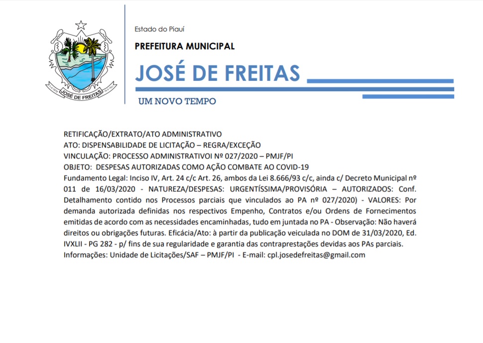 RETIFICAÇÃO/EXTRATO/ATO ADMINISTRATIVO ATO: DISPENSABILIDADE DE LICITAÇÃO – REGRA/EXCEÇÃO VINCULAÇÃO: PROCESSO ADMINISTRATIVOI Nº 027/2020