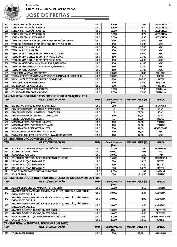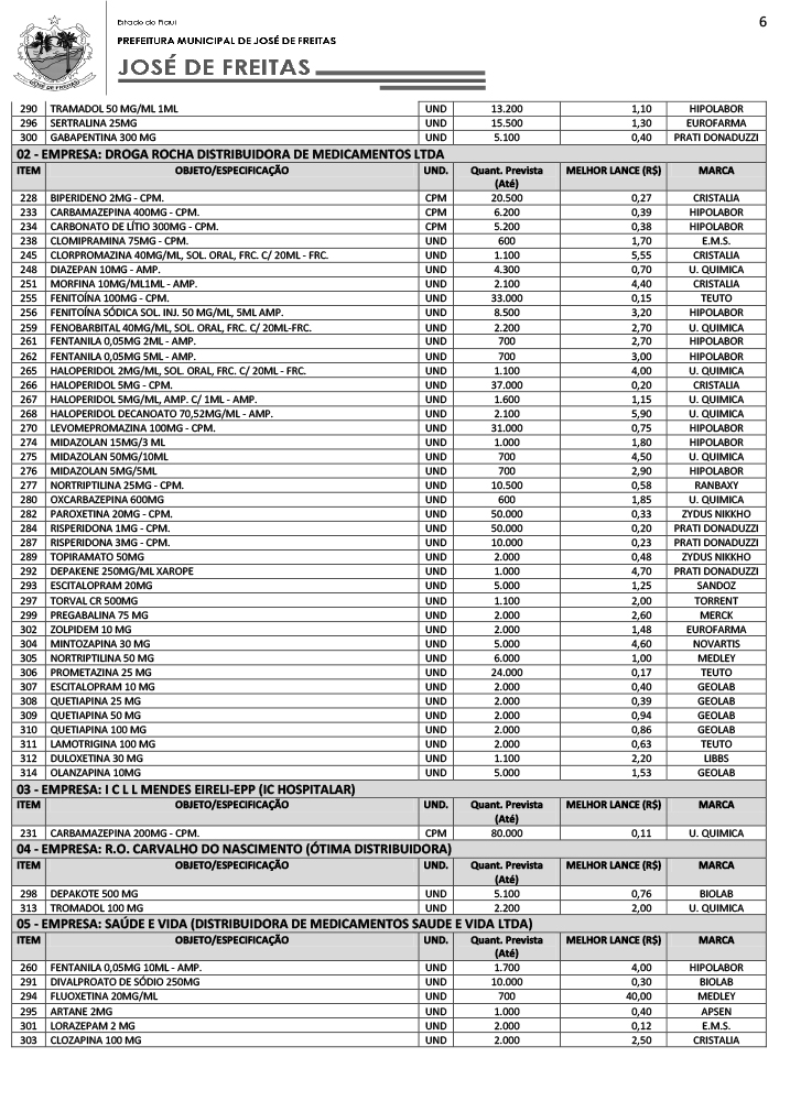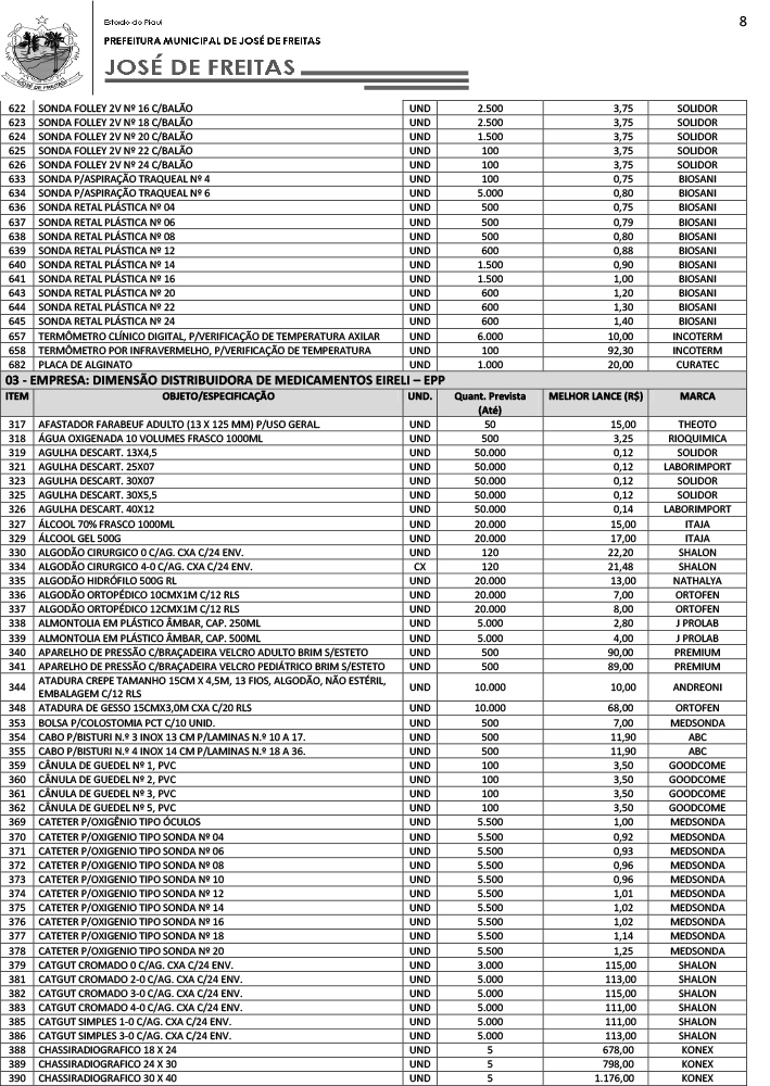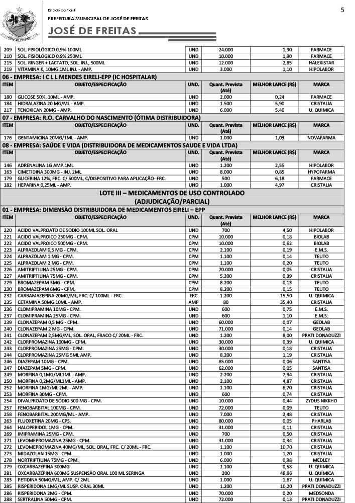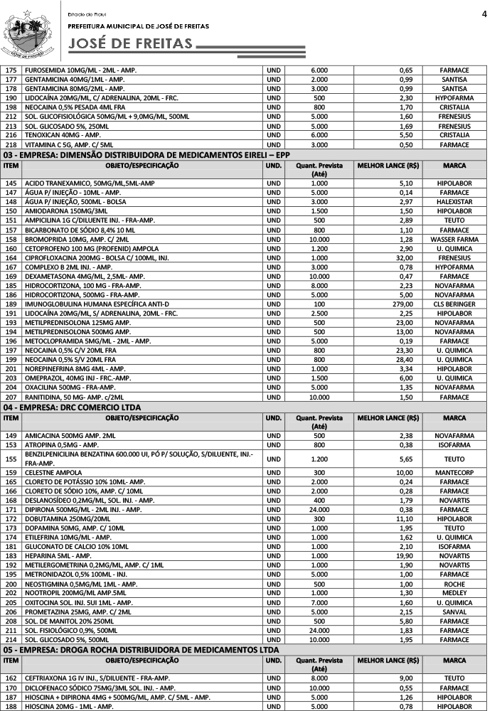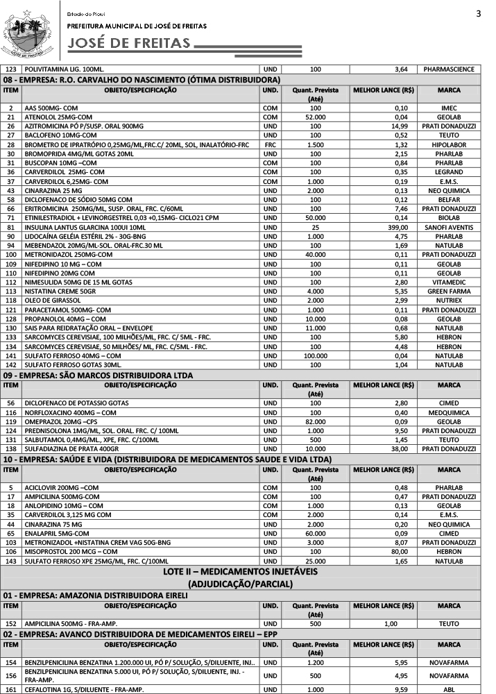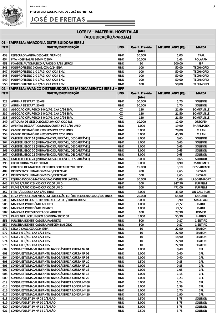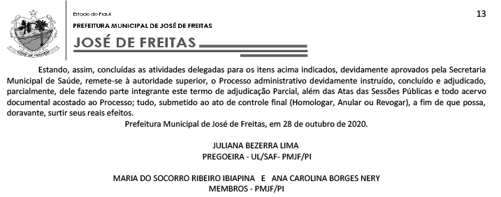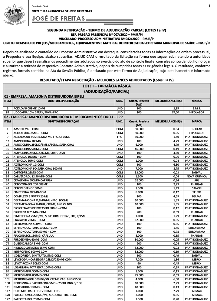 SEGUNDA RETIFICAÇÃO - TERMO DE ADJUDICAÇÃO PARCIAL (LOTES I a IV) REF. PREGÃO PRESENCIAL Nº 007/2020 – PMJF/PI VINCULADO: PROCESSO ADMINISTRATIVO Nº 042/2020 – PMJF/PI OBJETO: REGISTRO DE PREÇOS /MEDICAMENTOS, EQUIPAMENTOS E MATERIAL DE INTERESSE DA SECRETARIA MUNICIPAL DE SAÚDE – PMJF/PI Depois de analisado o conteúdo do Processo Administrativo em destaque, consideradas todas as informações de ordem processual, a Pregoeira e sua Equipe, abaixo subscritas, ADJUDICAM o resultado da licitação na forma que segue, submetendo à autoridade superior que deverá reanalisar os procedimentos adotados no exercício do ato de controle final e, com eles concordando, homologar e autorizar a retirada do respectivo Contrato Administrativo, depois de cumpridas todas as exigências legais. O resultado, conforme registros f