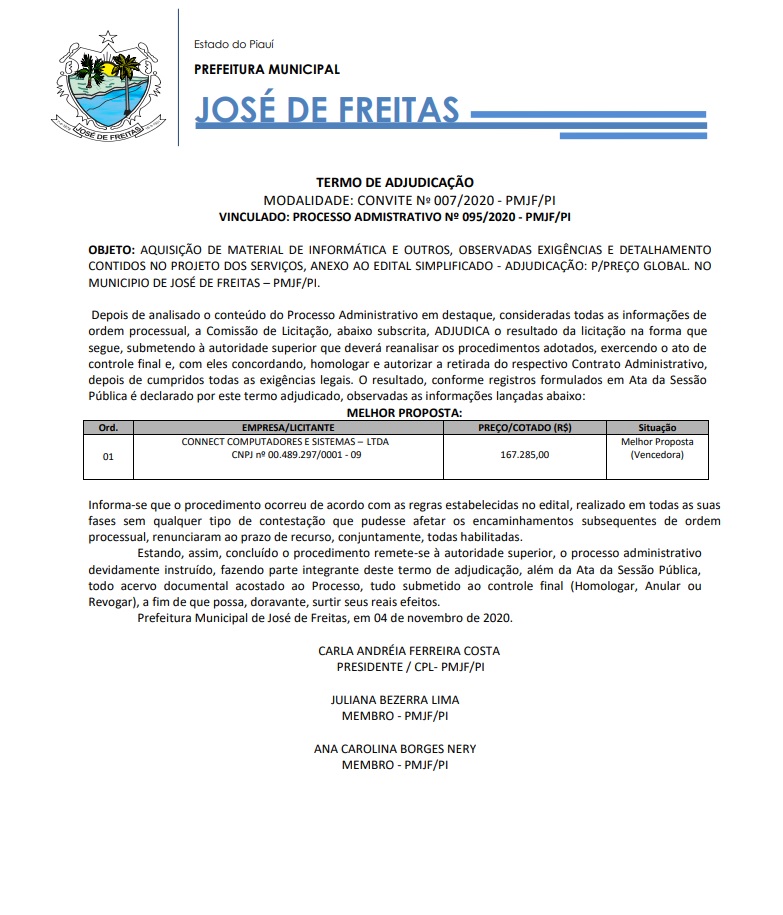 TERMO DE ADJUDICAÇÃO MODALIDADE: CONVITE Nº 007/2020 - PMJF/PI VINCULADO: PROCESSO ADMISTRATIVO Nº 095/2020 - PMJF/PI OBJETO: AQUISIÇÃO DE MATERIAL DE INFORMÁTICA E OUTROS, OBSERVADAS EXIGÊNCIAS E DETALHAMENTO CONTIDOS NO PROJETO DOS SERVIÇOS, ANEXO AO EDITAL SIMPLIFICADO - ADJUDICAÇÃO: P/PREÇO GLOBAL. NO MUNICIPIO DE JOSÉ DE FREITAS – PMJF/PI. Depois de analisado o conteúdo do Processo Administrativo em destaque, consideradas todas as informações de ordem processual, a Comissão de Licitação, abaixo subscrita, ADJUDICA o resultado da licitação na forma que segue, submetendo à autoridade superior que deverá reanalisar os procedimentos adotados, exercendo o ato de controle final e, com eles concordando, homologar e autorizar a retirada do respectivo Contrato Administrativo, depois de cumpridos todas as exigências legais. O resultado, conforme registros formulados em Ata da Sessão Pública é declarado por este termo adjudicado, observadas as informações lançadas abaixo: MELHOR PROPOSTA: Ord. EMPRESA/LICITANTE PREÇO/COTADO (R$) Situação 01 CONNECT COMPUTADORES E SISTEMAS – LTDA 1) CNPJ nº 00.489.297/0001 - 09 167.285,00 Melhor Proposta (Vencedora) Informa-se que o procedimento ocorreu de acordo com as regras estabelecidas no edital, realizado em todas as suas fases sem qualquer tipo de contestação que pudesse afetar os encaminhamentos subsequentes de ordem processual, renunciaram ao prazo de recurso, conjuntamente, todas habilitadas. Estando, assim, concluído o procedimento remete-se à autoridade superior, o processo administrativo devidamente instruído, fazendo parte integrante deste termo de adjudicação, além da Ata da Sessão Pública, todo acervo documental acostado ao Processo, tudo submetido ao controle final (Homologar, Anular ou Revogar), a fim de que possa, doravante, surtir seus reais efeitos. Prefeitura Municipal de José de Freitas, em 04 de novembro de 2020. CARLA ANDRÉIA FERREIRA COSTA PRESIDENTE / CPL- PMJF/PI JULIANA BEZERRA LIMA MEMBRO - PMJF/PI ANA CAROLINA BORGES NERY MEMBRO - PMJF/PI