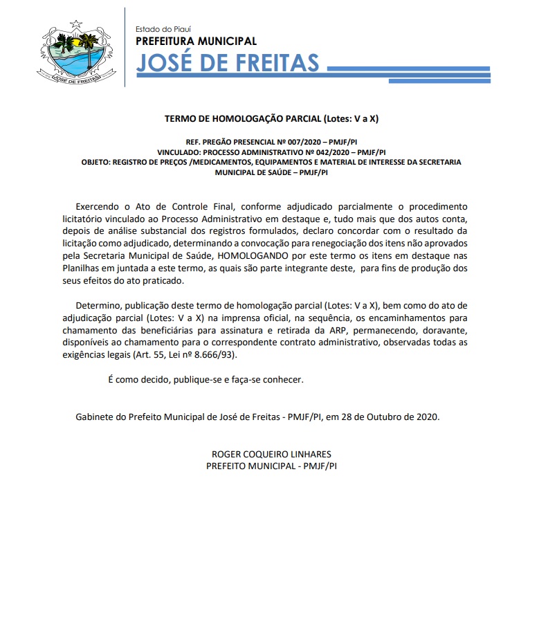 TERMO DE HOMOLOGAÇÃO PARCIAL (Lotes: V a X) REF. PREGÃO PRESENCIAL Nº 007/2020 – PMJF/PI