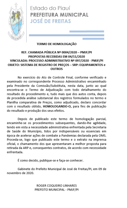 Gabinete do Prefeito Municipal de José de Freitas/PI, em 09 de novembro de 2020.