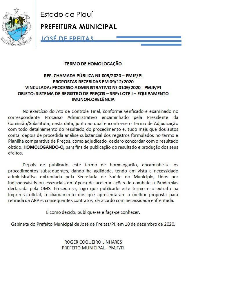 TERMO DE HOMOLOGAÇÃO REF. CHAMADA PÚBLICA Nº 005/2020 – PMJF/PI PROPOSTAS RECEBIDAS EM 09/12/2020 VINCULADA: PROCESSO ADMINISTRATIVO Nº 0109/2020 - PMJF/PI OBJETO: SISTEMA DE REGISTRO DE PREÇOS – SRP: LOTE I – EQUIPAMENTO IMUNOFLORECÊNCIA