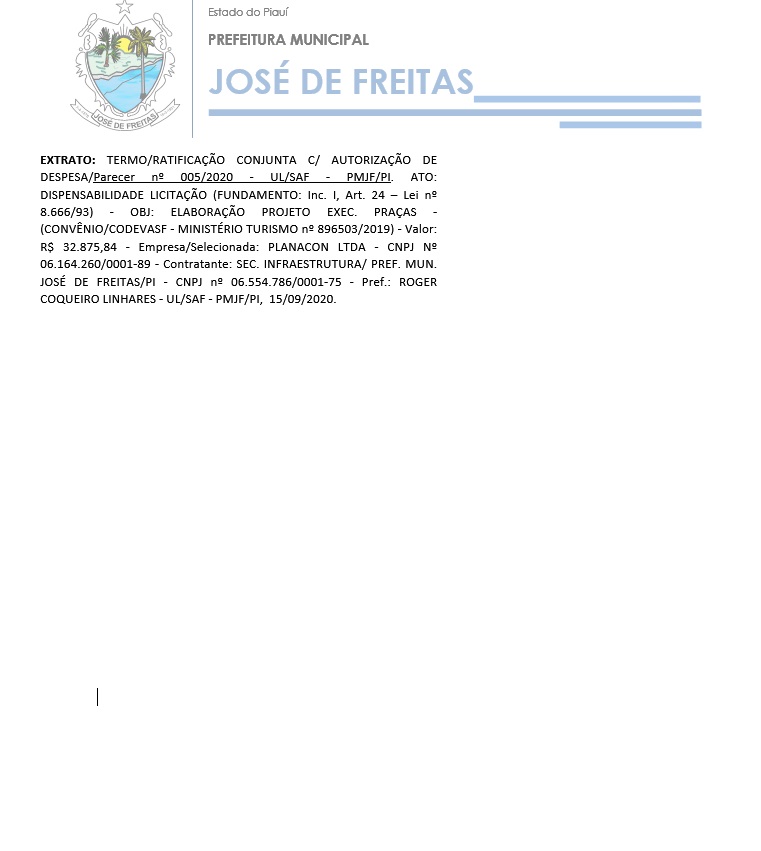EXTRATO: TERMO/RATIFICAÇÃO CONJUNTA C/ AUTORIZAÇÃO DE DESPESA/Parecer nº 005/2020 - UL/SAF - PMJF/PI. ATO: DISPENSABILIDADE LICITAÇÃO (FUNDAMENTO: Inc. I, Art. 24 – Lei nº 8.666/93) - OBJ: ELABORAÇÃO PROJETO EXEC. PRAÇAS - (CONVÊNIO/CODEVASF - MINISTÉRIO TURISMO nº 896503/2019) - Valor: R$ 32.875,84 - Empresa/Selecionada: PLANACON LTDA - CNPJ Nº 06.164.260/0001-89 - Contratante: SEC. INFRAESTRUTURA/ PREF. MUN. JOSÉ DE FREITAS/PI - CNPJ nº 06.554.786/0001-75 - Pref.: ROGER COQUEIRO LINHARES - UL/SAF - PMJF/PI, 15/09/2020.