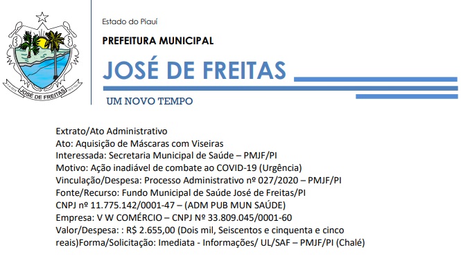 Vinculação/Despesa: Processo Administrativo nº 027/2020 – PMJF/PI | Ato: Aquisição de Máscaras com Viseiras