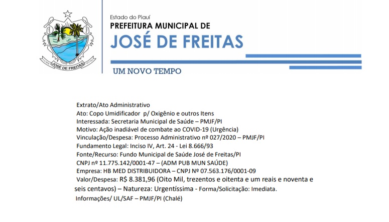 Vinculação/Despesa: Processo Administrativo nº 027/2020 – PMJF/PI | Ato: Copo Umidificador p/ Oxigênio e outros Itens