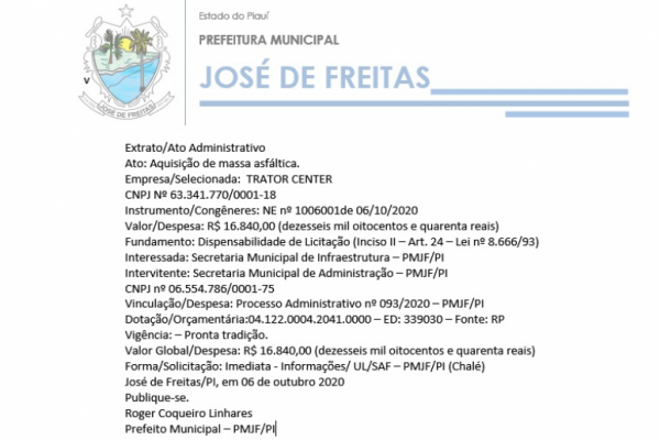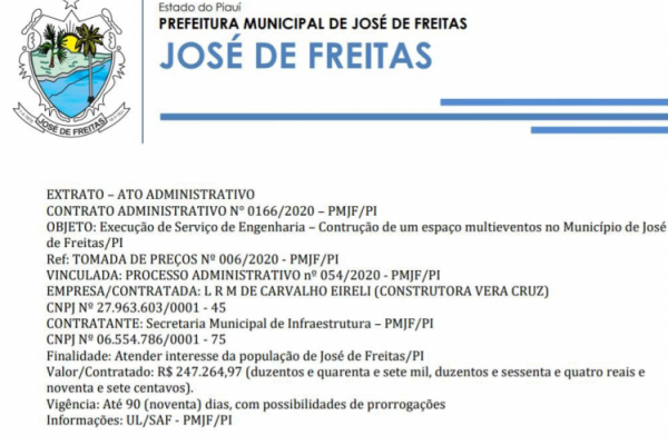 ATO: Contrato Administrativo nº 0164/2020 - PMJF/PI Vinculação: PROCESSO ADMINISTRATIVO Nº 064/2020 - PMJF/PI (Ref. PP nº 009/2020 – PMJF/PI)