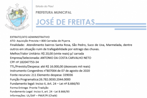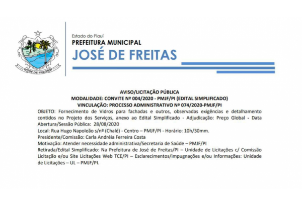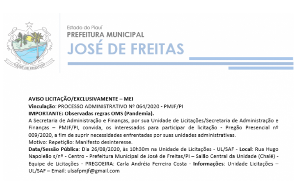 A Secretaria de Administração e Finanças, por sua Unidade de Licitações/Secretaria de Administração e Finanças – PMJF/PI, convida, os interessados para participar de licitação - Pregão Presencial nº 009/2020, a fim de suprir necessidades enfrentadas por suas unidades administrativas.