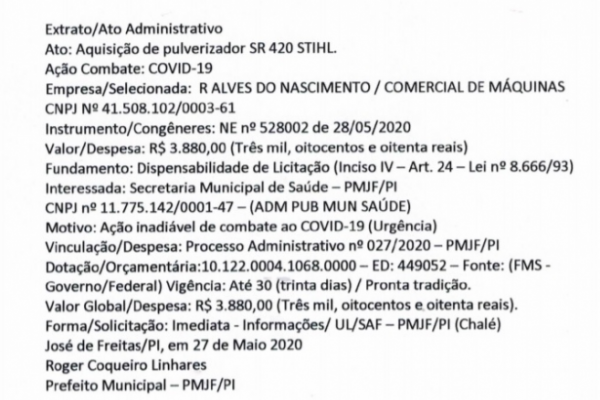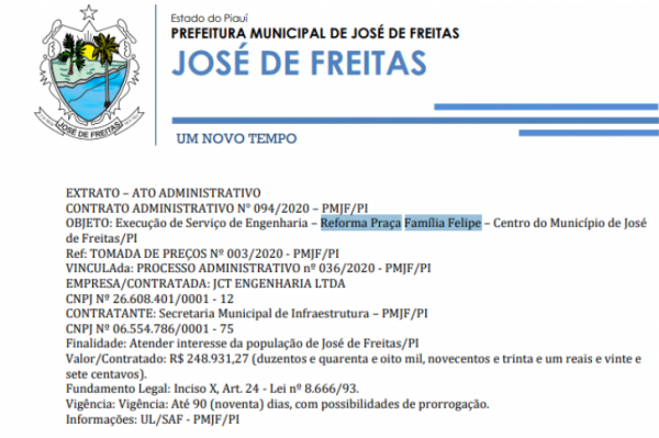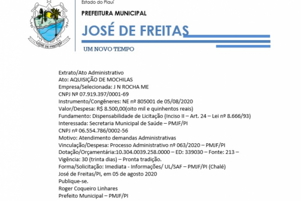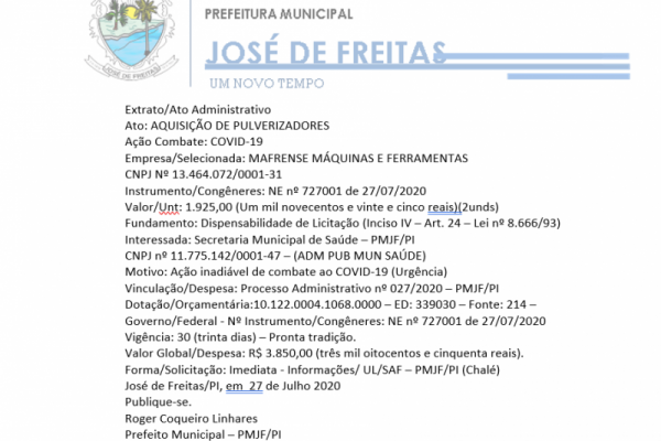 Vinculação/Despesa: Processo Administrativo nº 027/2020 – PMJF/PI