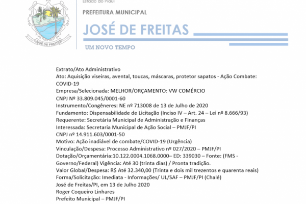 Extrato/Ato Administrativo Ato: Aquisição viseiras, avental, toucas, máscaras, protetor sapatos - Ação Combate: COVID-19
