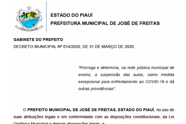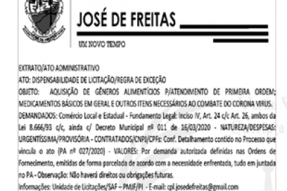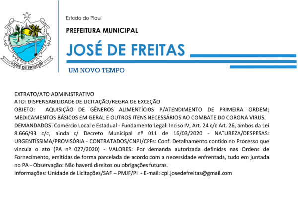 Diante da grave situação enfrentada pelo País, no mundo e, também no município de José de Freitas/PI, a autoridade abaixo subscrita, em análise da gravidade da situação e quase instalação do caos por pânico da população, vem, no dever da função, à título do que fez o Poder Executivo Federal(MP 926/2020), Estadual e, também Decreto Municipal,adotar algumas medidas para enfrentar as primeiras necessidades da população, a qual estar fadada ao isolamento provisório, trânsito fora dos limites do município, a fim de evitar a proliferação e multiplicação do vírus, evitando que que a maior parte das pessoas não sejam infectadas.