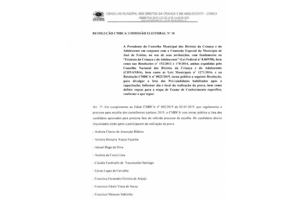 RESOLUÇÃO CMDCA/ COMISSÃO ELEITORAL Nº 10. LISTA DE APROVADOS A PRÓXIMA FASE.