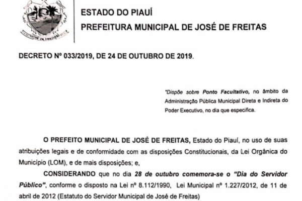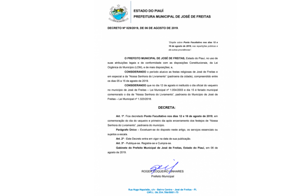 Ponto Facultativo| Prefeito Roger Linhares decreta ponto facultativo nos dias 12 e 16 de agosto de 2019