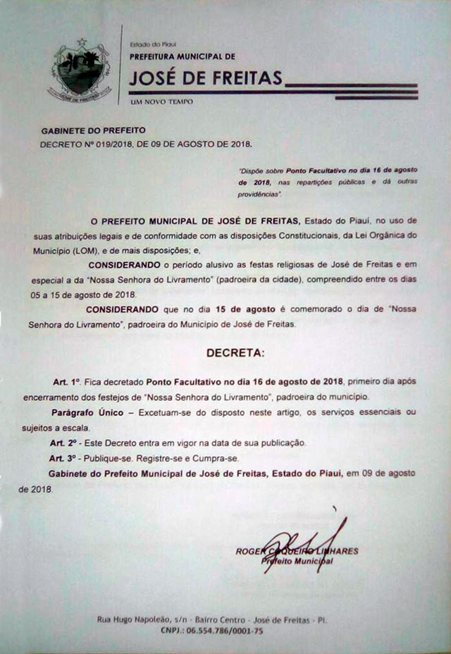 Decreto 19/2018| Ponto facultativo no dia 16/08/2018