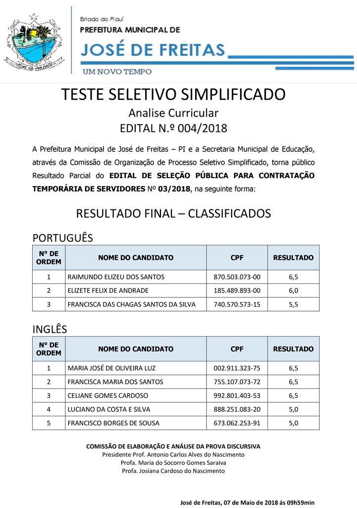 TESTE SELETIVO SIMPLIFICADO EDITAL N.º 003/2018