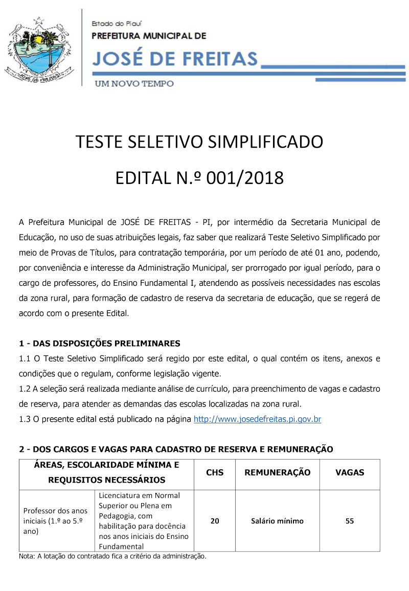 TESTE SELETIVO SIMPLIFICADO EDITAL N.º 001/2018