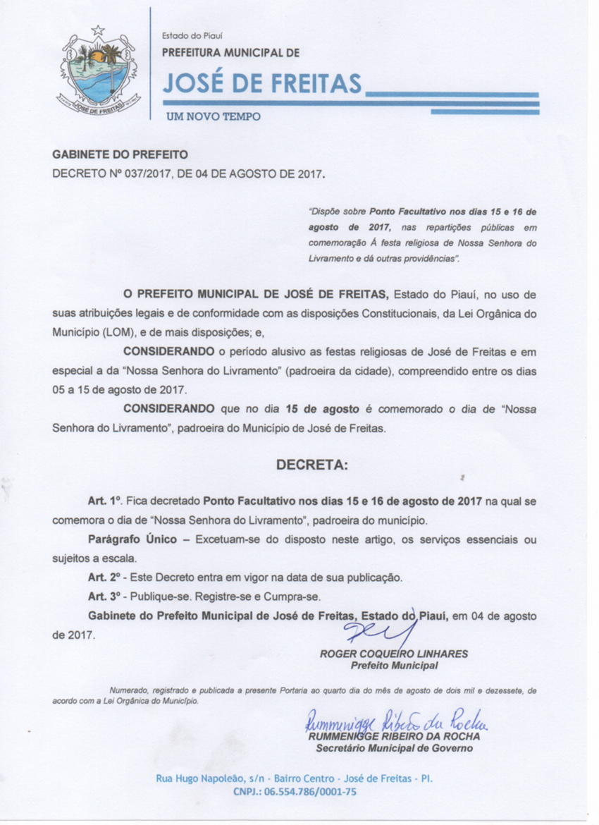 Prefeito decreta ponto facultativo dias 15 e 16 de Agosto de 2017